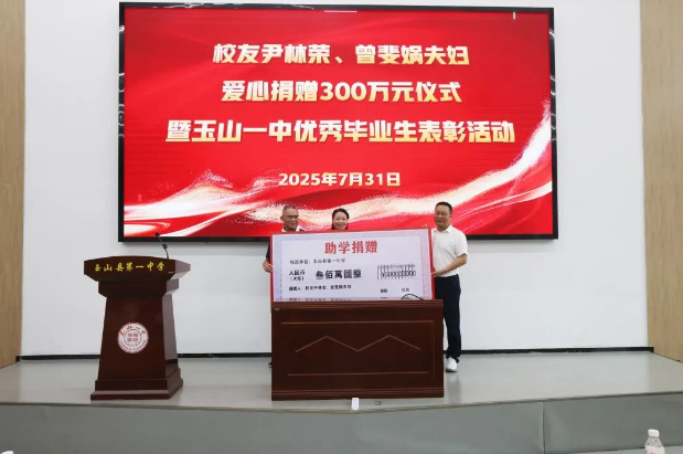 7月31日上午,一場(chǎng)飽含深情的捐贈(zèng)儀式在玉山一中崇文樓隆重舉行。該校杰出校友、江西省匯佳置業(yè)有限公司法定代表人尹林榮與夫人曾斐媧慷慨捐贈(zèng)300萬(wàn)元善款,專項(xiàng)用于母校助學(xué)助教、獎(jiǎng)優(yōu)濟(jì)困。今年考入北京大學(xué)、清華大學(xué)等頂尖學(xué)府的優(yōu)秀學(xué)子及家長(zhǎng)代表共同見(jiàn)證了這一暖心時(shí)刻。