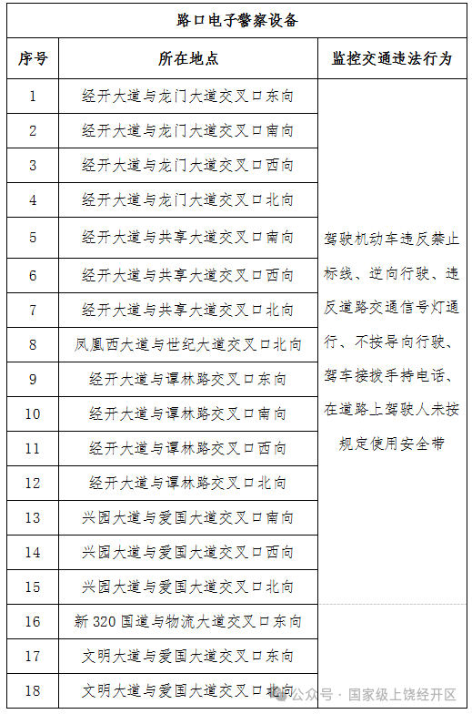 為保障群眾出行安全和道路交通暢通,預防和減少道路交通事故發(fā)生,全力營造良好的道路交通環(huán)境,依據(jù)《中華人民共和國道路交通安全法》《中華人民共和國道路交通安全法實施條例》《江西省實施〈中華人民共和國道路交通安全法〉辦法》等相關法律法規(guī),將于2025年10月23日零時起,在上饒經(jīng)濟技術(shù)開發(fā)區(qū)范圍啟用一批交通技術(shù)監(jiān)控設備?,F(xiàn)將具體信息公告如下: