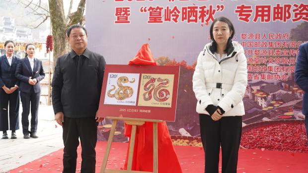 祥龍賀瑞辭舊歲,金蛇納福啟新程。1月5日上午,由婺源縣人民政府、中國郵政集團有限公司上饒市分公司主辦,中共婺源縣委宣傳部、江灣鎮(zhèn)人民政府、婺源篁嶺文旅股份有限公司、中國郵政集團有限公司江西省婺源縣分公司承辦的2025《乙巳年》特種郵票首發(fā)暨《篁嶺曬秋》專用郵資圖發(fā)行系列活動在婺源篁嶺景區(qū)舉行。婺源縣人民政府副縣長李甜甜、中國郵政集團有限公司上饒市分公司黨委委員、副總經(jīng)理盧敏、婺源縣委宣傳部常務副部長詹榮鈞、江灣鎮(zhèn)黨委書記江偉、婺源篁嶺文旅股份有限公司董事長吳向陽、中國郵政集團有限公司上饒市分公司市場部經(jīng)理于潔、中國郵政集團有限公司江西省婺源縣分公司總經(jīng)理潘林峰、上饒市集郵協(xié)會學術(shù)委員會主任方立武出席郵票發(fā)行活動現(xiàn)場。李甜甜、盧敏、江偉、吳向陽共同為2025《乙巳年》特種郵票首發(fā)暨《篁嶺曬秋》專用郵資圖發(fā)行系列活動揭幕。