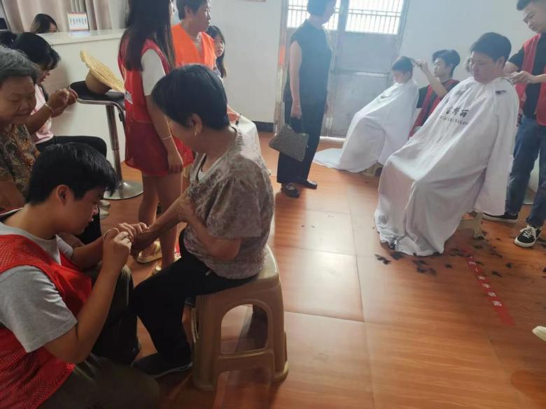 活動現(xiàn)場暖意融融,志愿者們分工協(xié)作,忙碌的身影穿梭在老人中間。理發(fā)區(qū)里,志愿者手持剪刀,一邊細致地為老人修剪頭發(fā),一邊輕聲詢問 “這樣的長度您滿意嗎?”“要不要再修得短一點?” 輕柔的話語搭配嫻熟的手藝,讓老人們在輕松的氛圍中換了新發(fā)型,鏡中的自己精神抖擻,笑容也格外燦爛。