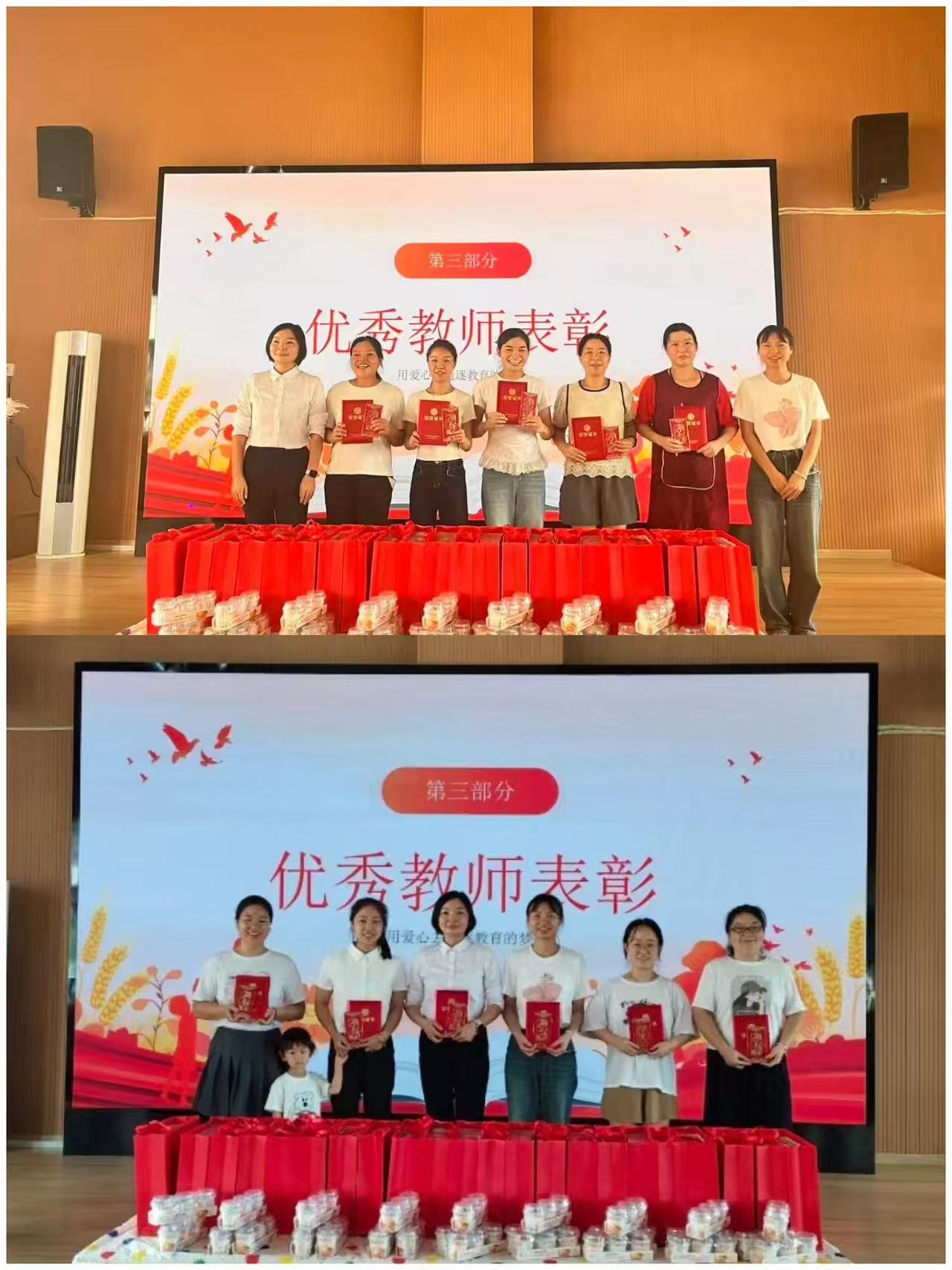 隨后,優(yōu)秀教師代表上臺分享。首先向大家送上節(jié)日祝福,接著講述自己在幼教工作里的成長與感悟,分享和同事協(xié)作、在教學(xué)中探索的收獲。最后表示會帶著對幼教事業(yè)的熱愛,繼續(xù)認真工作,和大家一起為幼兒園發(fā)展、為孩子成長貢獻力量。