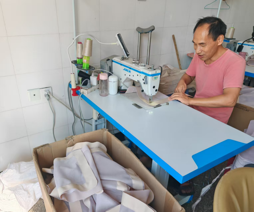 當縫紉機送到家時,他輕輕踩下踏板,熟悉的“嗡嗡”聲響起,積壓多日的愁云一下子散了?!皠傞_始做簡單的箱包縫合,一天能做幾十個,按件算錢,一個月下來能有兩千多元收入?!鼻癖χf,現(xiàn)在訂單穩(wěn)定,他越做越熟練,收入比在浙江打工時還高些。