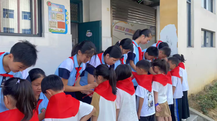 激昂的中國少年先鋒隊(duì)隊(duì)歌旋律響起,全體人員齊聲高唱。歌聲嘹亮,充滿朝氣,展現(xiàn)了少先隊(duì)員們積極向上的精神風(fēng)貌。學(xué)生們身著整潔校服,隊(duì)列整齊,神情專注。儀式核心環(huán)節(jié)中,老隊(duì)員鄭重為新隊(duì)員佩戴紅領(lǐng)巾——這一革命先烈鮮血染紅的象征。新隊(duì)員挺胸昂首,眼神洋溢著自豪與激動(dòng),紛紛敬禮致謝,傳遞著薪火相傳的使命。