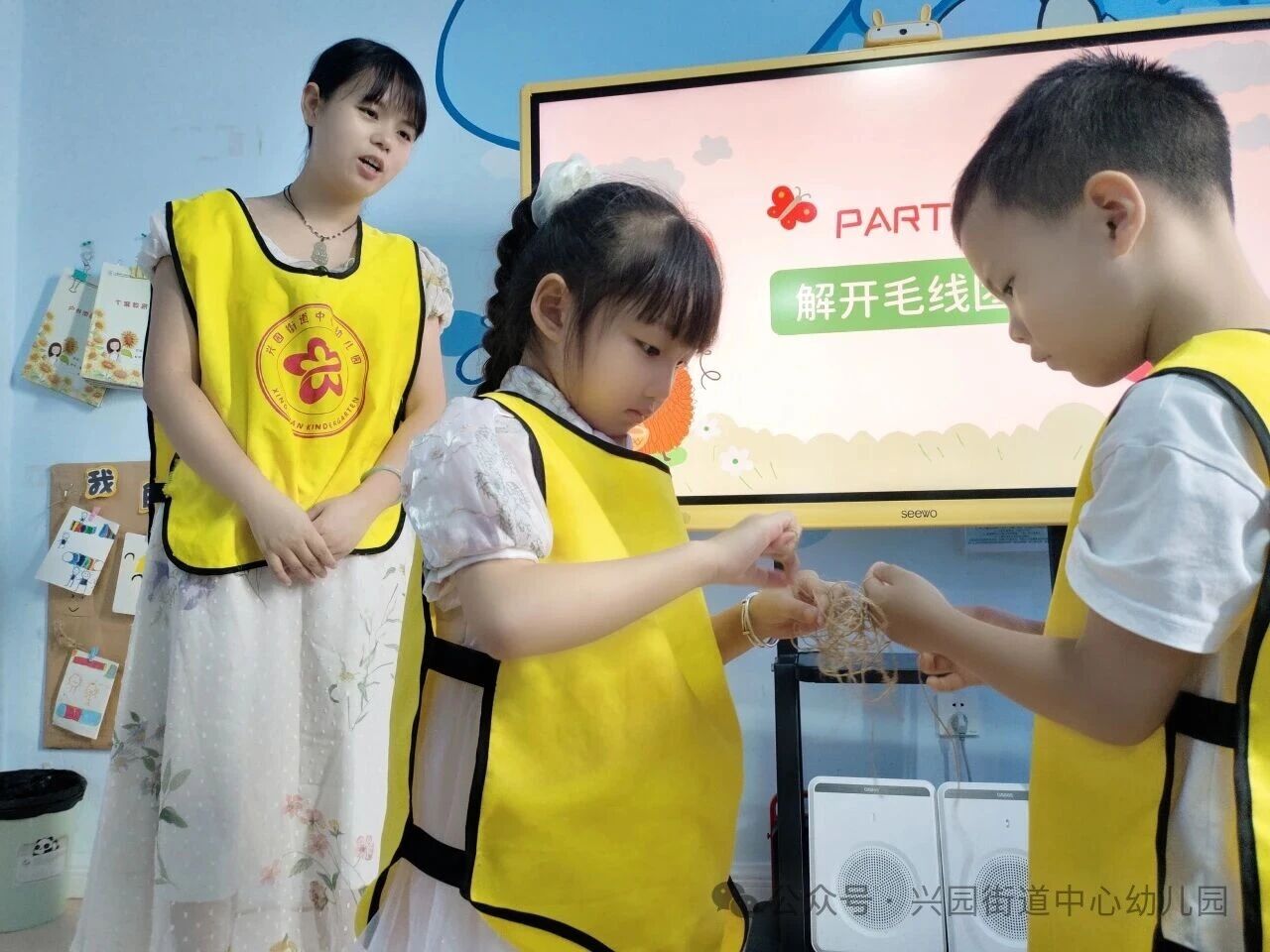 手工環(huán)節(jié)“解開毛線團(tuán)”更是將課程推向高潮。孩子們小手耐心的解開“解開毛線團(tuán)”,臉上有著開心、著急、期待等情緒但都被耐心給替代了。老師引導(dǎo)他們分享:“當(dāng)你解不開毛線團(tuán)的時候是什么心情,把毛線團(tuán)解開又是什么心情呢?孩子們在輕松的氛圍中學(xué)會識別和表達(dá)自身感受,也理解了“耐心等待會讓期待的事情更美好”。