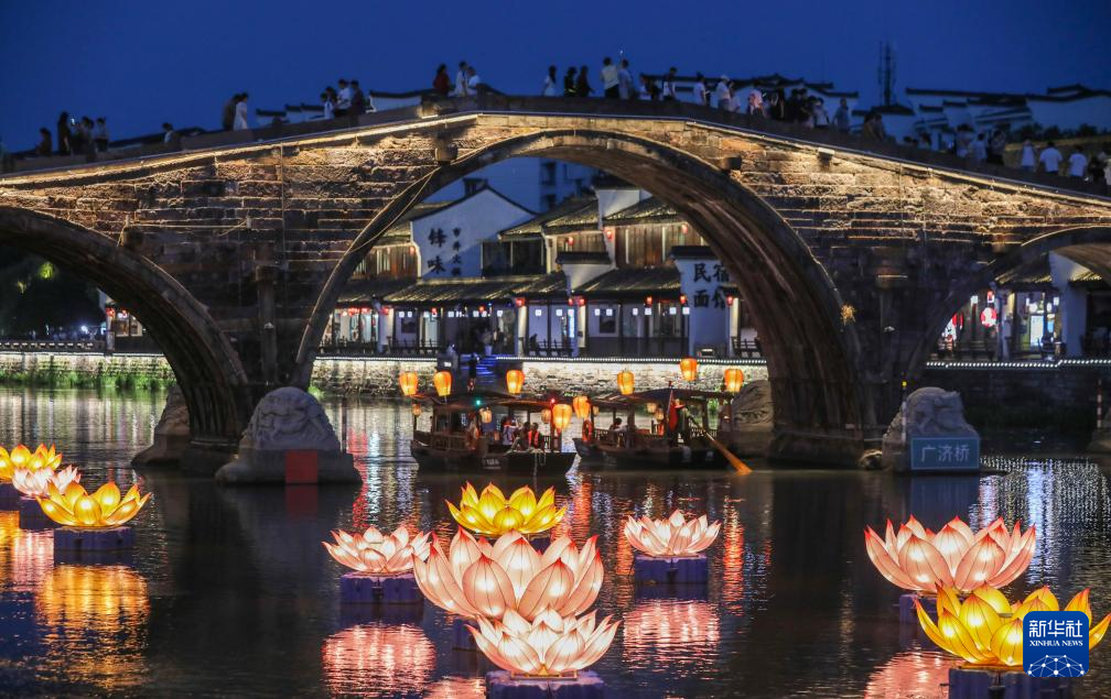 國(guó)慶中秋“雙節(jié)”期間,浙江省杭州市臨平區(qū)塘棲古鎮(zhèn)推出“月滿運(yùn)河·夢(mèng)棲塘棲”祈福之夜活動(dòng)。游客們可以體驗(yàn)運(yùn)河搖櫓船夜游、賞運(yùn)河花燈、廣濟(jì)橋賞月等特色活動(dòng),感受水鄉(xiāng)古鎮(zhèn)的運(yùn)河雅韻。